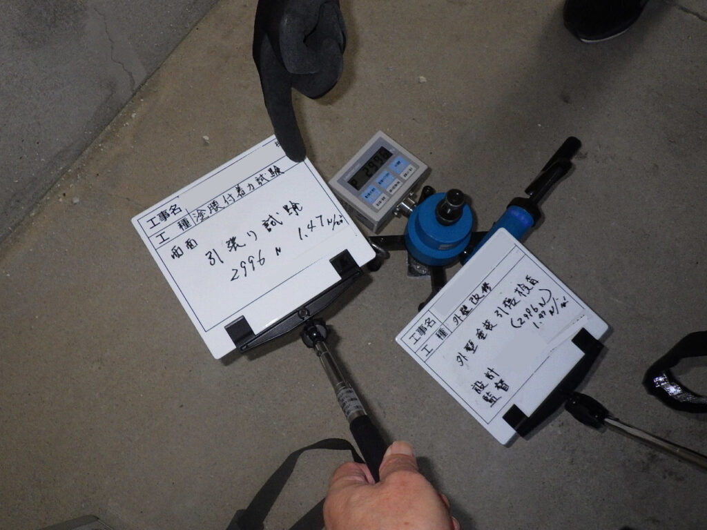 塗料やモルタルなどの材料が壁面(躯体)にどれだけしっかり付いているか、その強度を測るための試験です。建物のメンテナンスにおいて、塗膜の劣化状況を確認したり、補修工事における工法選定の判断材料としたりする目的で行われます。