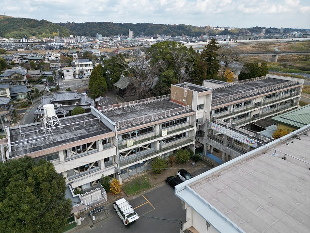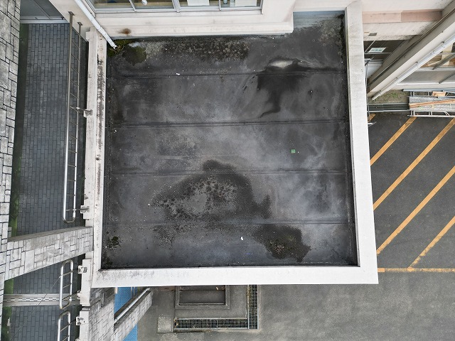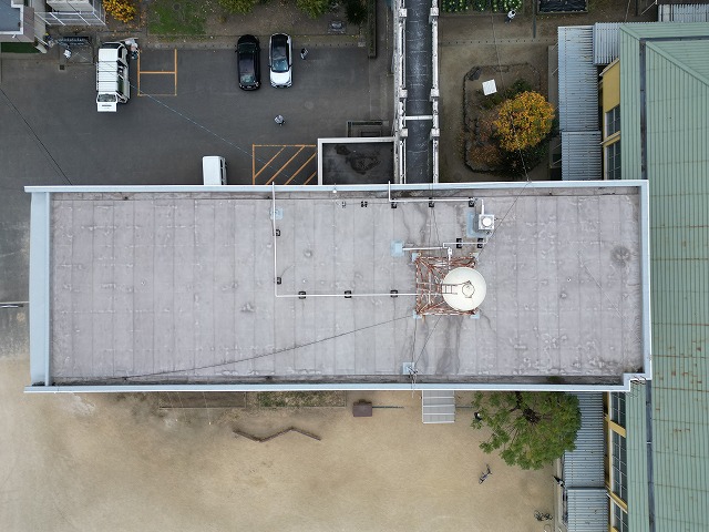 ドローンを使って、上空から調査を行う建物の全景を確認し、屋根・屋上面の検査を行います