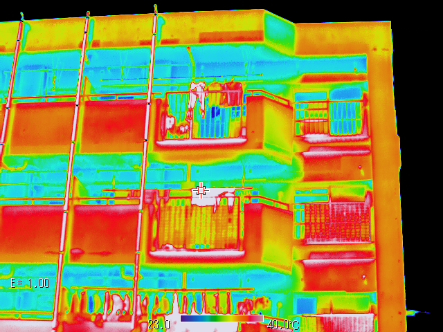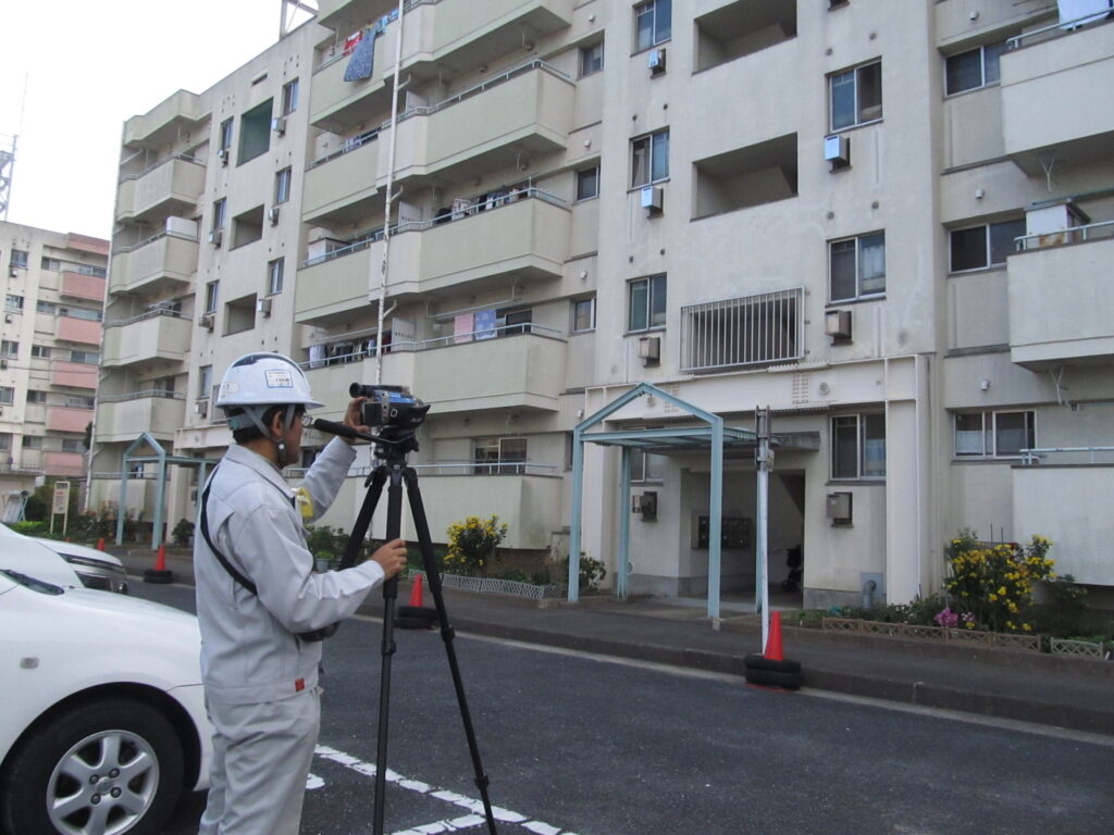 赤外線カメラを使って、構造物の劣化状況を確認します。建物の外壁の温度分布を赤外線カメラで測定し、内部の劣化や異常を非破壊で検出する調査方法です。温度差を可視化することで、目視では捉えにくい浮きや剥離、雨漏り、断熱材の劣化などを早期に発見できます。