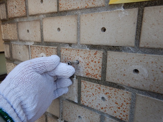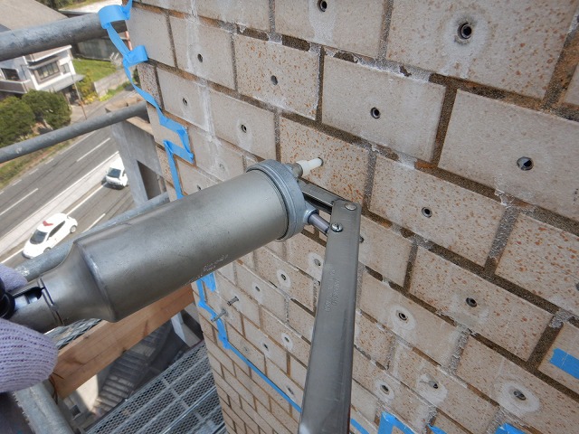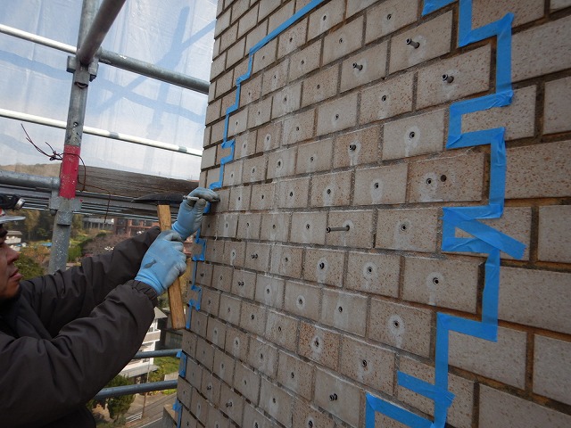 外壁タイルの浮きや剥落を防止するための改修工法です。特殊なアンカーピンをタイルに打ち込み、エポキシ樹脂などを注入して、タイルをコンクリート躯体に強固に固定します。これにより、タイルの落下による事故を防ぎ、建物の美観と安全性を保つことができます。