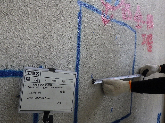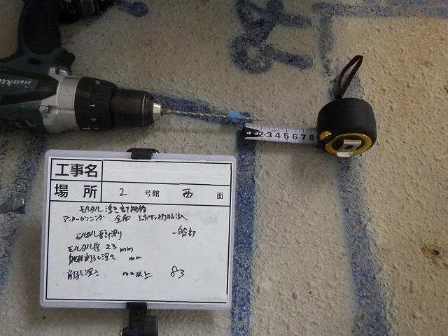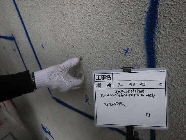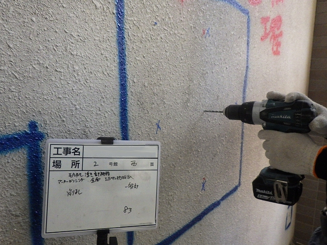ドリルで孔をあけ、アンカーピンを挿入し、エポキシ樹脂を注入して固定することで、タイルやモルタルの剥離を防ぎます。
