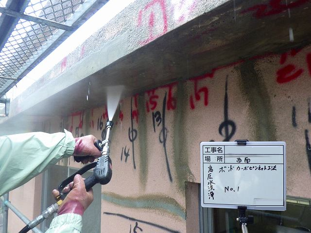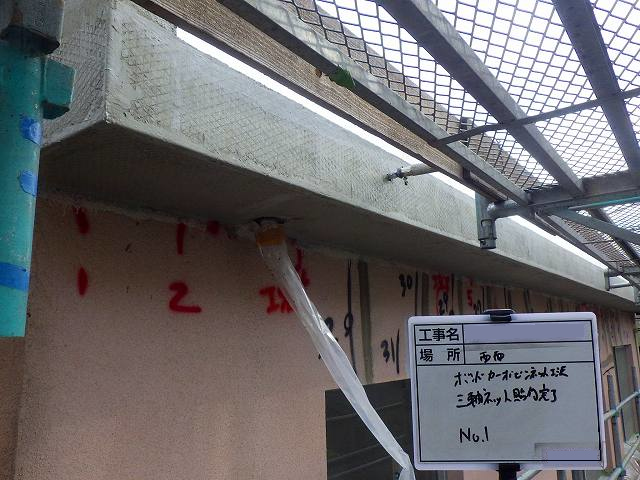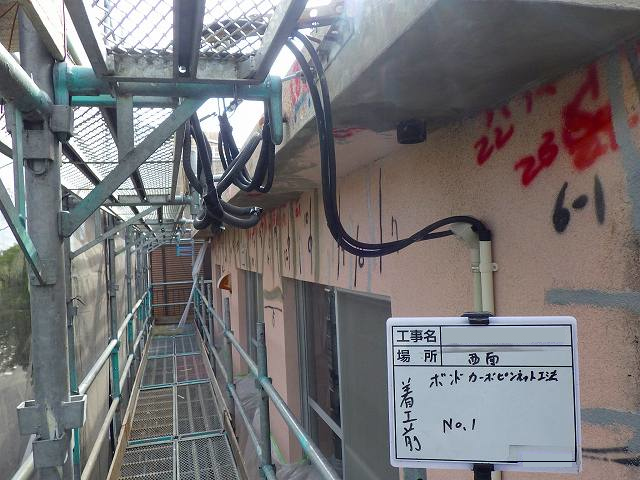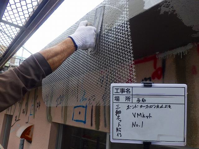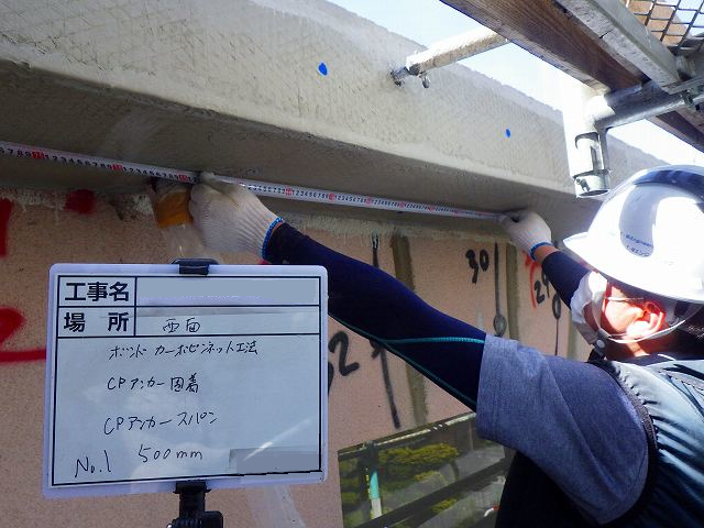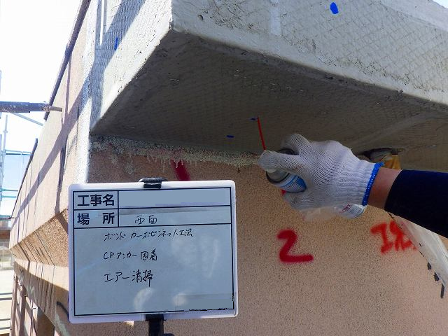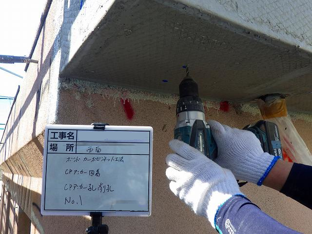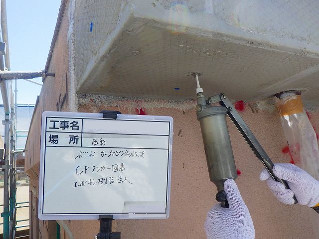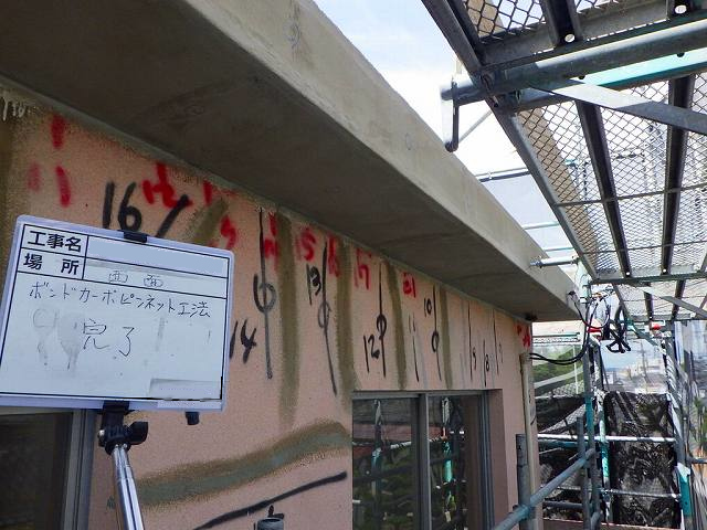 ボンドカーボピンネット工法とは、外壁のタイルやモルタルなどの剥落を防止し、壁面を補強する改修工法です。繊維ネットとカーボンファイバー含有ポリマーセメントで壁面を一体化し、ステンレスアンカーピンでコンクリート躯体に固定することで、長期的に剥落を防止します。
